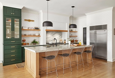 A G-shaped modular kitchen extends a U-shape with a peninsula, providing extra storage, counter space, and seating for large homes.