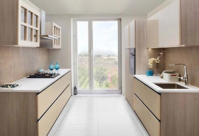 A parallel modular kitchen has two opposing countertops, offering high efficiency, smooth workflow, and ideal functionality for narrow or compact spaces.