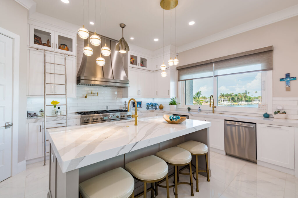 An island modular kitchen in Durga Nagar includes a central counter for prep, dining, or storage, blending contemporary luxury with practical functionality.