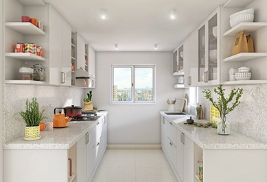 A parallel modular kitchen in Indira Colony features two opposing countertops, ideal for narrow spaces, ensuring smooth workflow and highly efficient cooking.