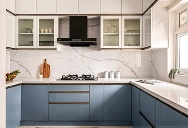 U-shaped and G-shaped kitchens in Indira Colony are perfect for large families and open-plan spaces, offering ample storage, counters, and seating.