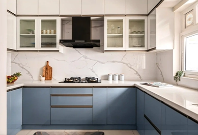A U-shaped modular kitchen in Kailash Nagar connects three counters, maximizing storage and workspace while combining modern design, durability, and efficiency.