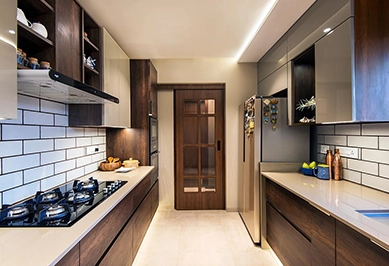 A parallel modular kitchen in Kailash Nagar features two opposing countertops, ideal for narrow spaces, ensuring smooth workflow and efficient cooking experience.
