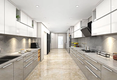 A parallel modular kitchen has two countertops facing each other, maximizing efficiency, ensuring smooth workflow, and perfectly suited for narrow spaces.