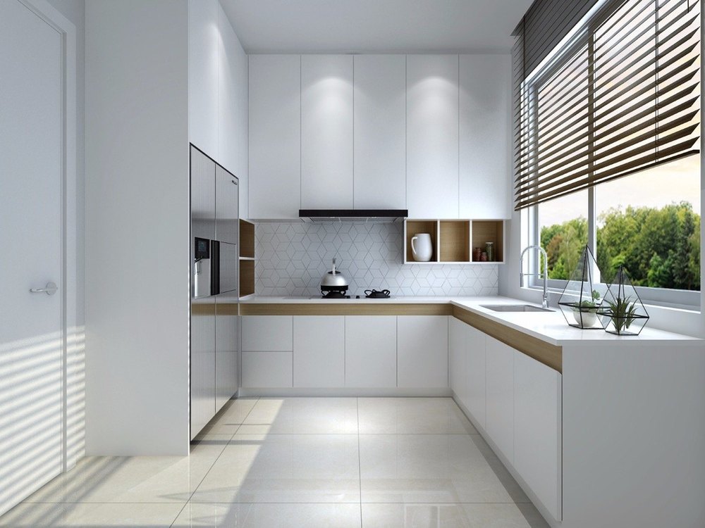 A U-shape modular kitchen uses three connected counters, maximizing storage and workspace while ensuring efficiency, durability, style, and modern functionality.