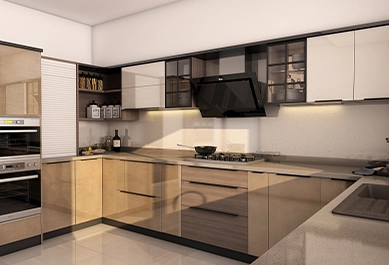 Prime Moduler’s U-shaped modular kitchen maximizes storage and workspace with three connected counters, blending style, durability, and modern functionality.