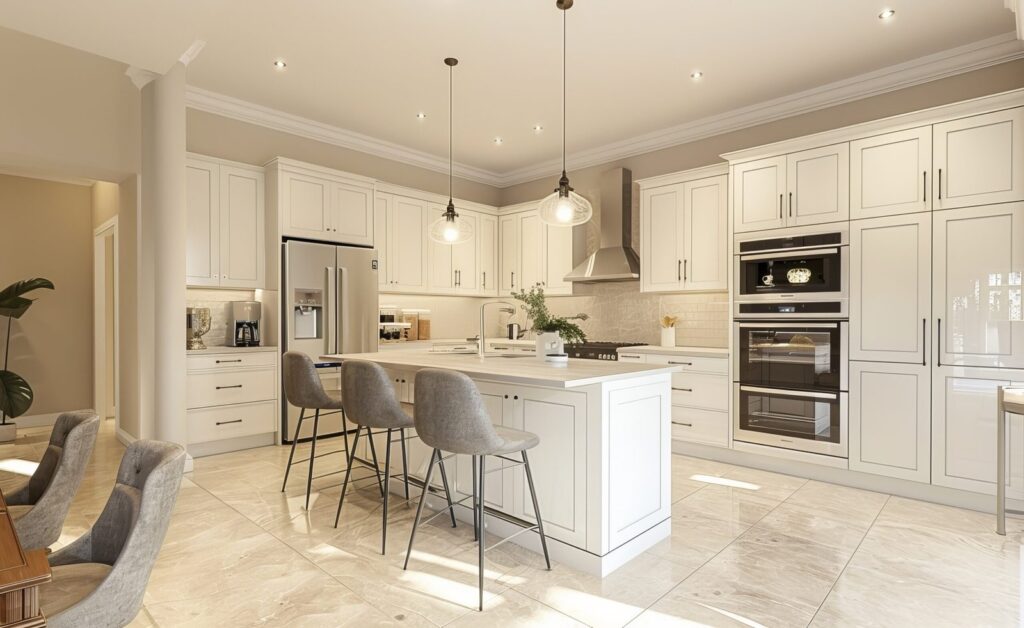 Prime Moduler’s island modular kitchen features a central counter for prep, dining, and storage, blending style with modern functionality.