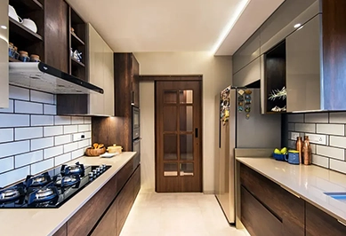 A parallel modular kitchen has two facing counters, maximizing efficiency and storage, ideal for narrow spaces with smooth, functional workflow.