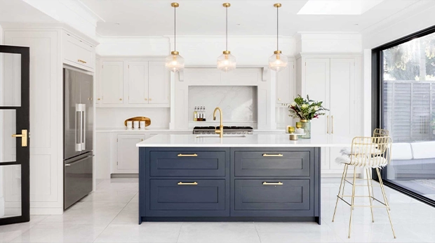 An island modular kitchen features a central counter for cooking, dining, or storage, combining modern style with practical functionality.
